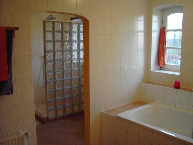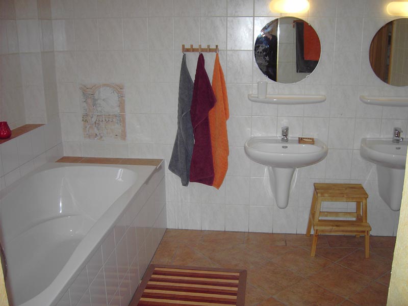 großzügige Bad mit Wanne, Dusche und Sauna. Der Anbau ist